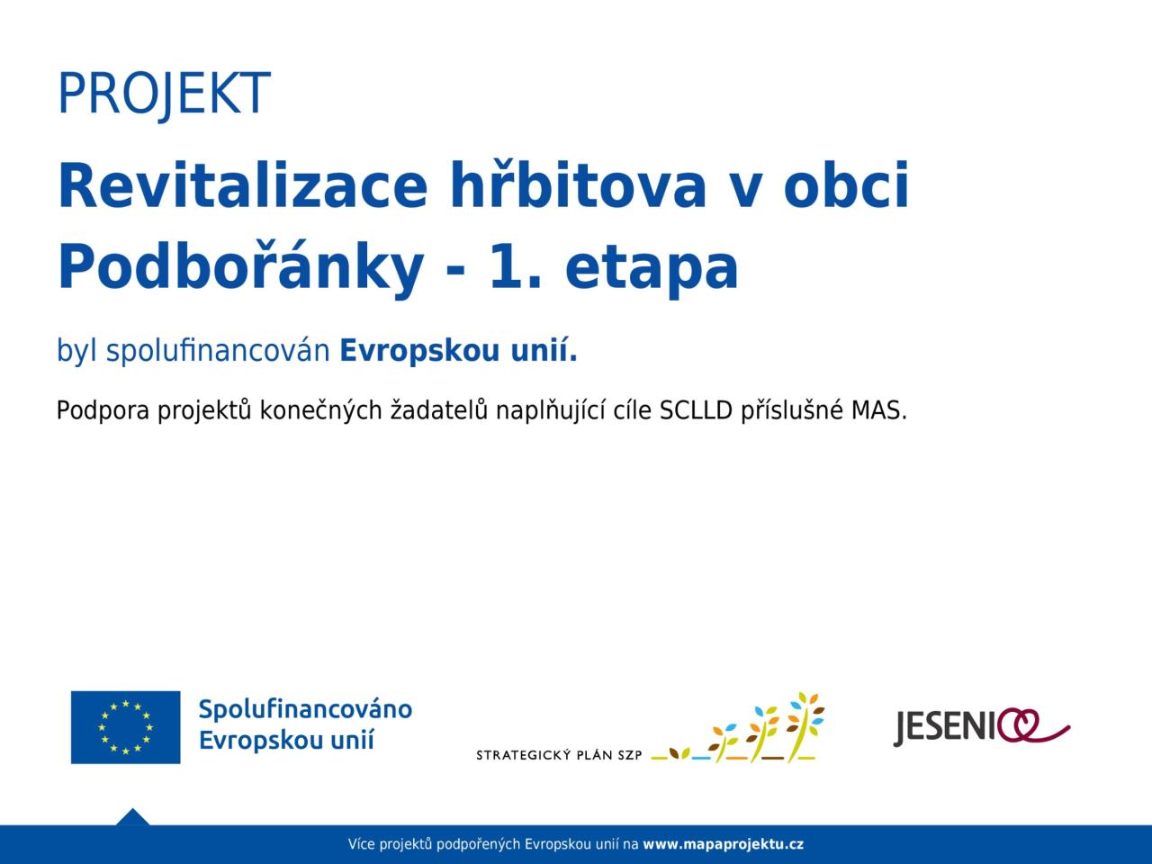 Záměrem projektu je realizace postupných oprav hřbitova v městské části Podbořánky, která se nachází 6 km jihozápadně od města Jesenice. Jedná se o malou zachovalou osadu s kostelem sv. Jakuba, kolem kterého se rozkládal původní hřbitov. V roce 1933, což dokládá letopočet na hlavním hřbitovním kříži a čelním štítu márnice, byl založen nový hřbitov. Tento se nachází v polích jižně od osady.